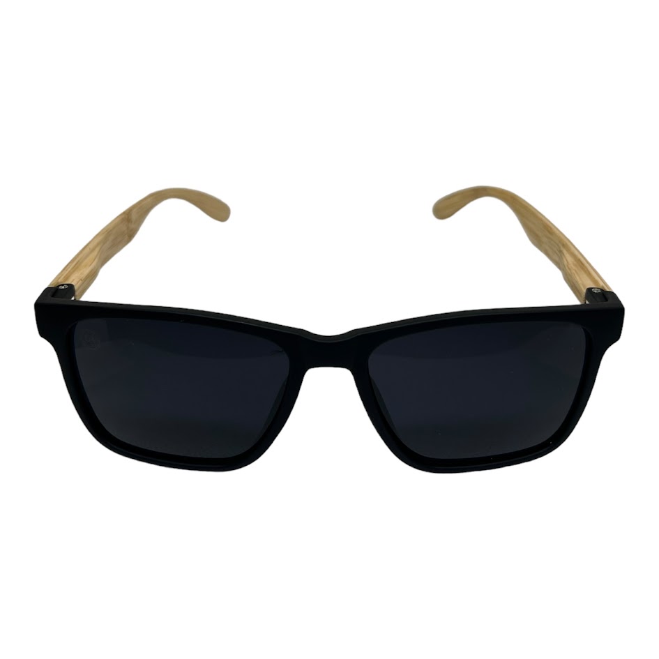O Óculos de Sol Brava Preto Madeira Clara possui um design moderno, em formato quadrado, possui a parte frontal em acetato na cor preta, haste em acetato com estampa de madeira clara e lentes na cor preta.