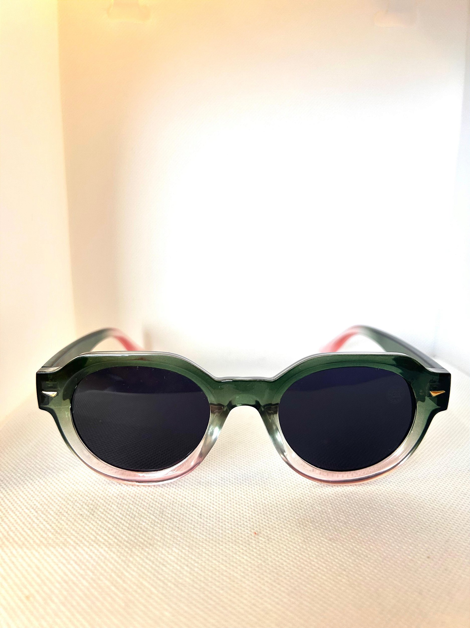 O Óculos de Sol Arvoredo Verde Mescla Rosa possui um design moderno, em formato redondo com lindo acabamento verde com mescla rosa, confeccionado em acetato italiano estampado. Lente na cor preta.
