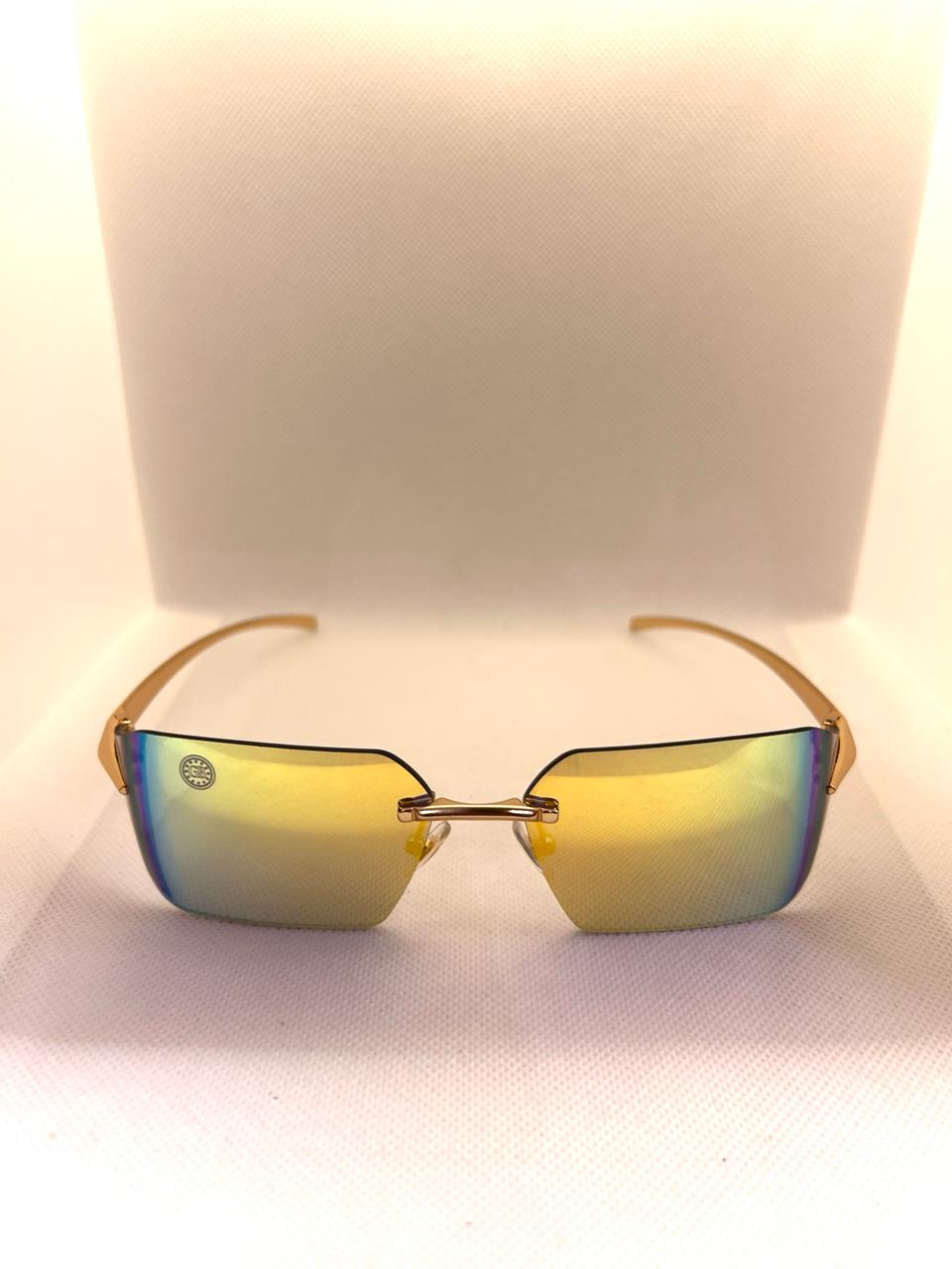 O Óculos de Sol Balneário Camboriú Camaleão Espelhado possui um design moderno com lentes camaleão espelhadas curvadas e armação em metal dourado.