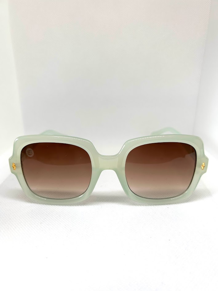 O Óculos de Sol Campeche Verde Cristal possui um design elegante, em formato quadrado, armação em acetato na cor verde, lentes degradê na cor marrom.
