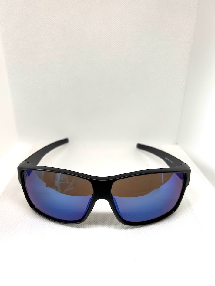 O Óculos de Sol Joaquina Azul Espelhado possui design esportivo, armação em acetato preto, detalhe de metal nas hastes e lentes azul espelhado.